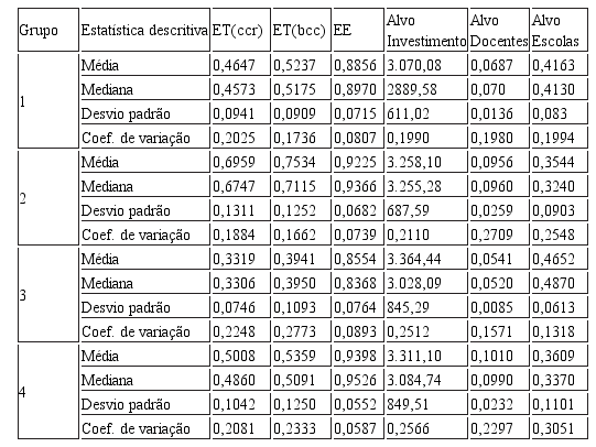 O grupo 1 e o grupo 4 possuem médias de eficiência técnica (ET/bcc) similares, cerca de 52% e 54%, respectivamente. Parece que no caso desses dois grupos existe uma relação mais linear do IDEB com os inputs, ou seja, o grupo 4 teve um resultado maior, pois aportou mais recursos, enquanto o grupo 1 aportou menos e teve uma eficiência menor, logo, as eficiências, dado a relação output/input, resultam uma similaridade. Entretanto, esse argumento se torna inválido se considerarmos os inputs e outputs dos grupos 3 e 2.