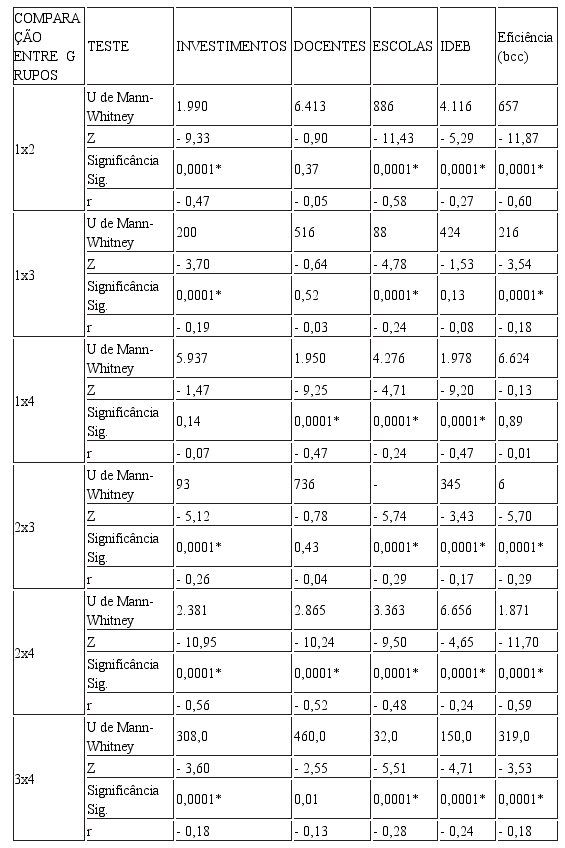 Por fim, a comparação entre os grupos 3 e 4 apresentou uma diferença significativa em investimentos (U= 308, r= -0,18), escolas por alunos (U= 32, r= -0,28), IDEB (U= 150,00, r= -0,24) e eficiência (U= 319, r= -0,18).