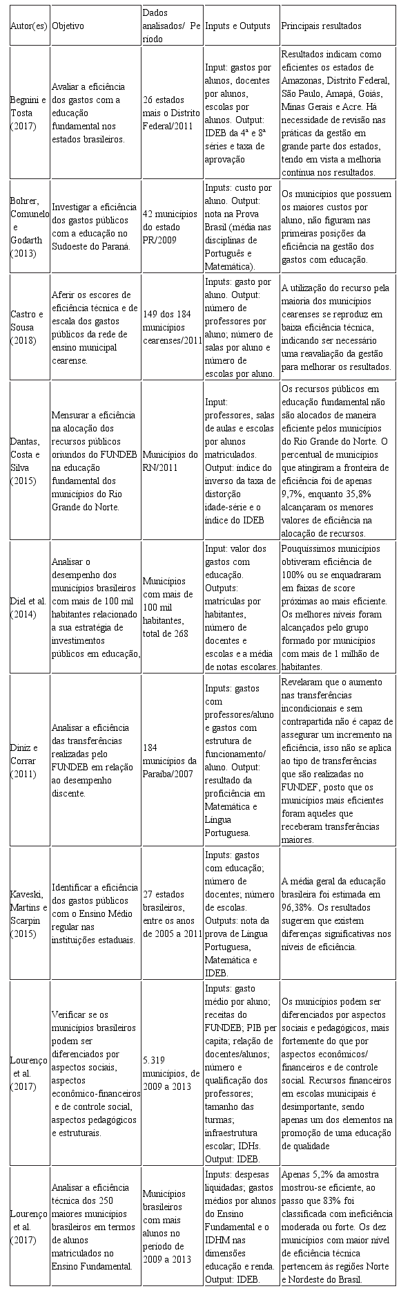 Como já constatado por Lourenço et al. (2017), Castro e Souza (2018) e Monte e Leopoldino (2017), estudos que utilizam da eficiência por meio da aplicação do método de Análise Envoltória de Dados (DEA) tem sido amplamente utilizado para avaliar a utilização dos investimentos públicos em educação.