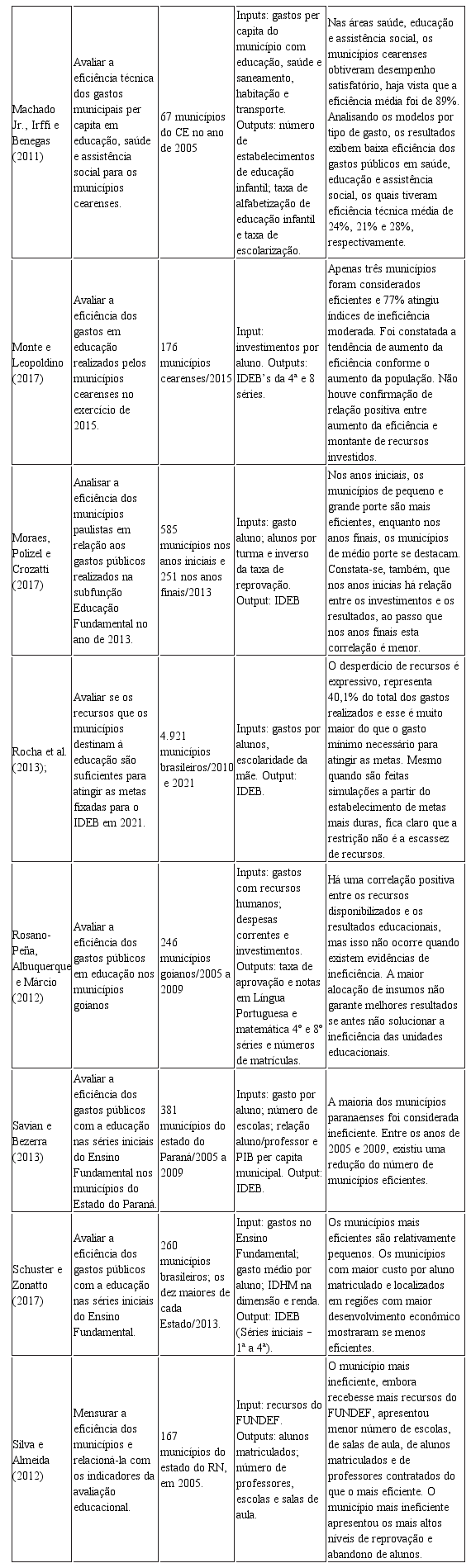 Importar imagenPara uma melhor compreensão do objeto em estudo, desenvolveu-se uma busca de artigos acadêmicos que tratam da eficiência dos gastos públicos em educação por meio da análise envoltória de dados. A relação dos artigos com seus respectivos objetivos, dados analisados, inputs e outputs e principais resultados é apresentada no Quadro 01.