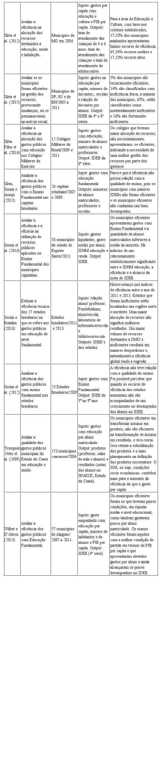 SILVA, J. L. M.; ALMEIDA, J. C. L. Eficiência no gasto público com educação: uma análise dos municípios do Rio Grande do Norte. Planejamento e Políticas Públicas, n. 39, 2012.
