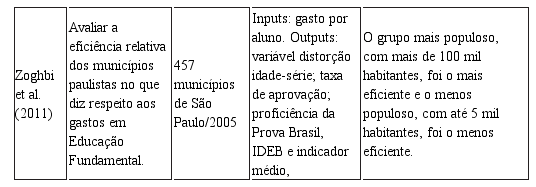 O segundo estudo destacado foi desenvolvido por Bohrer, Comunelo e Godarth (2013) e teve o objetivo de investigar a eficiência dos gastos públicos com a educação referente ao ano de 2009, nas 42 cidades do Sudoeste do Paraná. Foi aplicada a Análise Envoltória de Dados (DEA) com os seguintes inputs: despesas públicas liquidadas da área da Educação Básica municipal; número de alunos matriculados no Ensino Básico e gasto por aluno; já como output, utilizou-se o score da Prova Brasil, constituído pela média das provas de Matemática e Português e pela a média geral de cada município. O estudo apresenta que o município com a melhor eficiência nos gastos públicos é Barracão, seguido de Ampére e Capanema. Os municípios com o menor índice de eficiência foram Pinhal de São Bento, Manfrinópolis e Saudades do Iguaçu, ocupando os três últimos lugares, respectivamente. Salienta-se, também, que os municípios que possuem os maiores custos por aluno, não figuram nas primeiras posições da eficiência na gestão dos gastos com educação.