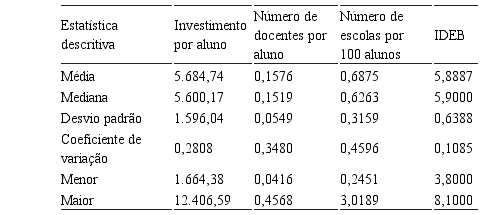 A Tabela 01 apresenta algumas estatísticas descritivas dos inputs investimentos por aluno, número de docentes por aluno e número de escolas por 100 alunos e o output IDEB.
