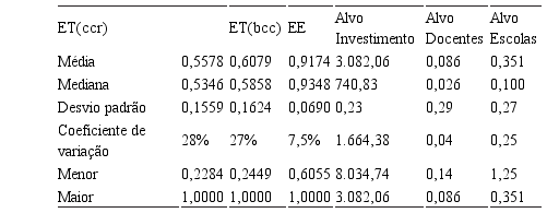 Através da tabela 2 constatou-se que os municípios, em média, devem investir por aluno R$ 3.082,06, possuir um número de docentes por aluno de cerca de 0,09, que significa cerca de 11 alunos por docente e cerca de 0,35 escolas por 100 alunos, ou seja, uma escola para cerca de 286 alunos. Tais dados correspondem aos alvos obtidos pela abordagem utilizada com orientação a inputs. Porém, em contrapartida, pode-se dizer que o resultado obtido se apresenta em um patamar muito aquém do eficiente verificado pelo modelo, uma vez que se são suficientes menos inputs para se alcançar os resultados obtidos, confirma-se a ineficiência técnica demonstrada.
