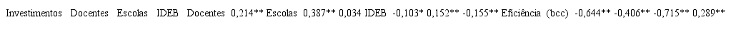 A variável Investimento possui uma correlação significativa negativa moderada com a variável Eficiência (n=389; p=-0,644; p<0,01); já com as variáveis Docentes (n=389; p=0,214; p<0,01) e Escolas (n=389; p=0,387; p<0,01), obteve-se uma correlação significativa positiva fraca e, em destaque, uma correlação significativa negativa fraca com o índice do IDEB (n=389; p=-0,103; p<0,05) . A variável Docentes não encontrou uma associação significativa (p<0,05) com Escolas, mas um relacionamento significativo negativo moderado com a variável Eficiência (n=389; p=-0,406; p<0,01) e uma correlação positiva negativa fraca com a variável IDEB (n=389; p=0,152; p<0,01). A variável Escola apresenta correlação negativamente forte com Eficiência (n=389; p=-0,715; p<0,01) e fracamente com IDEB (n=389; p=-0,155; p<0,01). Por fim, a variável IDEB tem uma relação positiva fraca com a Eficiência (n=389; p=0,289; p<0,01).