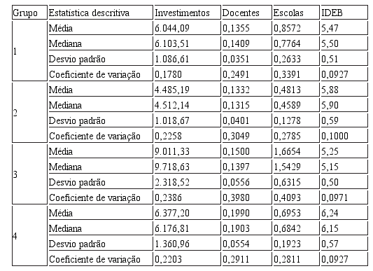Negativamente pode-se dar destaque ao grupo 3, que, apesar de ser pequeno, com apenas 12 municípios, possui o maior investimento por aluno, a segunda maior quantidade de docentes por alunos, a maior quantidade de escolas e a pior média de IDEB. O grupo 2 possui o segundo melhor IDEB e o menor investimento por aluno, como também o menor número de docentes por aluno e escolas por aluno. Destaca-se o grupo 4, o qual apresentou o melhor IDEB, são os municípios que possuem a maior quantidade de docentes por aluno, cerca de um docente para cada cinco alunos.