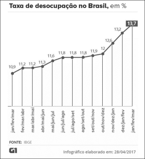 Irineu não parava de imaginar as consequências dessa troca de função, de fabricante para importador. Por um lado, lucros maiores poderiam garantir mais qualidade de vida para si, os sócios e seus familiares, mas por outro lado, lhe incomodava o fato de ter que fechar a fábrica, demitir mais de 50 funcionários, alguns com mais de 35 anos de serviço e a maioria com mais de oito anos trabalhados na empresa. Se isso realmente ocorrer, sabe que estará contribuindo para o agravamento do quadro social no Brasil, no qual se tem registrado aumento constante no nível de desemprego, conforme observado na Figura 1. De acordo com Silveira e Cavallini (2017) e Instituto Brasileiro de Geografia e Estatística (IBGE), por meio da pesquisa Pnad Contínua, o desemprego tem subido constantemente desde 2012. De janeiro a março de 2017, a taxa de desemprego no Brasil chegou a 13,7%, atingindo uma população de 14,2 milhões de pessoas.