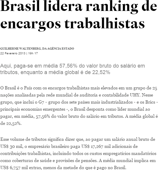 Irineu, buscando solucionar seu dilema e sempre consciente e atualizado lembra-se de uma matéria que leu no Jornal Estado de São Paulo, apontando o Brasil como o maior pagador de encargos trabalhistas do mundo (Figura 2) o fazendo pensar nas diversas implicações que sua decisão teria para sua indústria, na sua vida e na de seus funcionários.