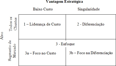 Uma empresa tem, portanto, três opções estratégicas __ liderança de custos, diferenciação ou enfoque (dividida em duas subopções – foco no custo ou foco na diferenciação), conforme mostra a figura 1.