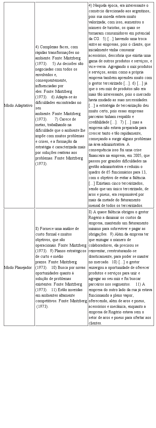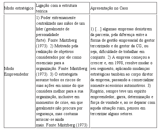 Analisando a estratégia da CG Centro Automotivo, percebe-se que seu método de formação de estratégia não é puro, mas uma mescla dos três modos de elaboração. Isto é descrito pelos fatos e falas apresentadas durante o caso que fomentam, os quais ora apresentam o modo empreendedor, ora apresentam o adaptativo e/ou planejador.