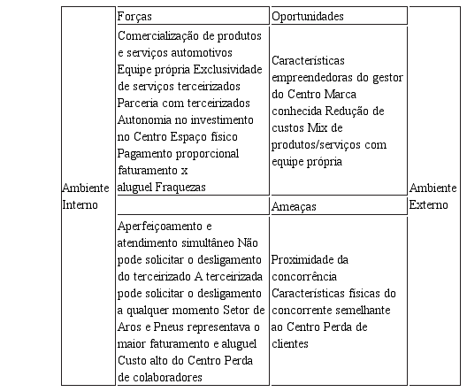 Oportunidades: características empreendedoras do gestor do Centro; marca conhecida no setor em que atua; redução de custos em relação aos seus concorrentes; assumir o mix de produtos/serviços dos terceirizados; realização dos serviços com equipe própria;