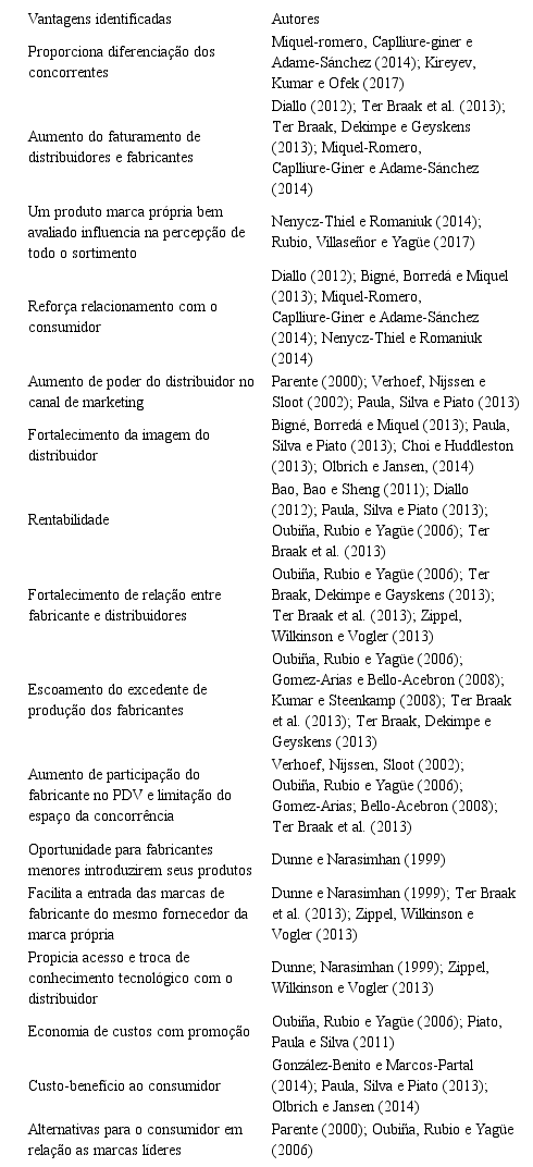 Caso distribuidores e fabricantes consigam entregar os atributos mencionados acima, várias outras vantagens, além das mencionadas, podem ser conquistadas por ambos na estratégia de marcas próprias. As principais vantagens destacadas pela literatura são apresentadas, respectivamente, no Tabela 1.