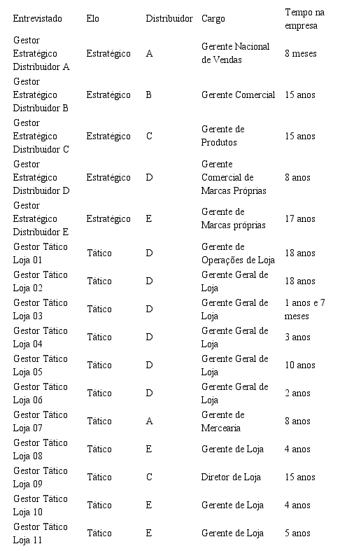 Percebendo a importância em considerar os aspectos operacionais da implantação e oferta de marcas próprias, assim como coletar opiniões de membros com maior proximidade do consumidor, foram incluídos os gerentes de onze lojas que compreendem quatro dos cinco distribuidores analisados nesse estudo (sendo denominados como Gestores Táticos Loja 01 a 11). As lojas dos quatro distribuidores foram escolhidas em amostra por conveniência pela localização e de acordo com a autorização das redes em relação à abordagem dos gerentes e disponibilidade dos entrevistados que concordaram em participar da entrevista.