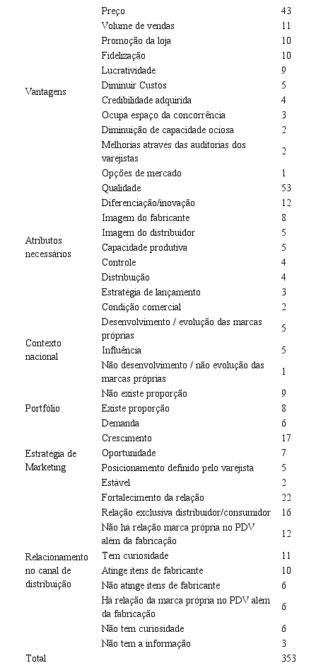Outros códigos citados na categoria com destaque foram: “Lucratividade” ligada ao bom resultado financeiro que as marcas próprias proporcionam para os fabricantes (TER BRAAK et al., 2013) como para os distribuidores (DAWES; NENYCZ-THIEL, 2013) devido ao seu custo reduzido obtido pelo ganho de escala; “Diminuir Custos”, relacionada aos fabricantes que podem entrar em uma rede sem a verba de cadastro, não ter ônus de comunicação no PDV, (OUBIÑA; RUBIO; YAGÜE, 2006; PIATO; PAULA; SILVA, 2011); a “Credibilidade adquirida” que uma marca própria pode proporcionar ao distribuidor detentor de sua propriedade (BIGNÉ; BORREDÁ; MIQUEL, 2013); e “Ocupa espaço da concorrência”, mencionado apenas pelos gestores táticos, que se refere à garantia de espaço na gôndola pelo fabricante com produto marca própria, consequentemente, limitando o da concorrência (GOMEZ-ARIAS; BELLO-ACEBRON, 2008).