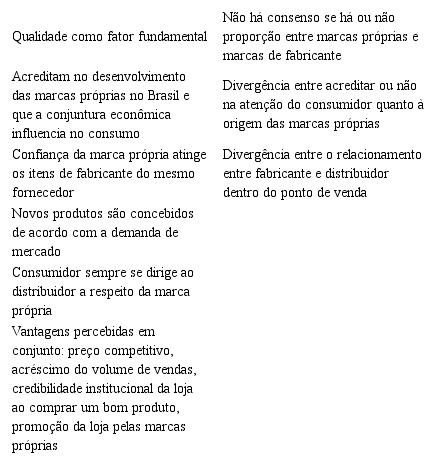 A maioria dos entrevistados acredita que o conceito de marca própria no Brasil evoluiu consideravelmente nos últimos anos quando comparada à realidade das economias em que essa estratégia está consolidada e, de forma unânime, acreditam que a atual conjuntura econômica brasileira influencia no crescimento do mercado de marcas próprias devido a razões como a recessão econômica e procura do consumidor por produtos que ofereçam maior custo benefício. Esse cenário se repete quando os gestores afirmam que houve crescimento da representatividade da marca própria tanto nas lojas individualmente, quanto nas redes em geral, e na crença das oportunidades geradas no mercado nacional, que ainda não está amadurecido, gerando alta expectativa de crescimento e, também, na conquista de parcerias e facilidades no canal de distribuição.