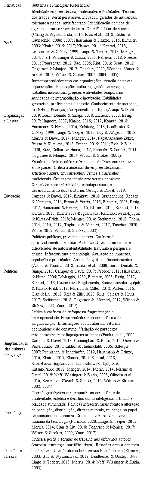 Algumas temáticas foram identificadas como centrais na produção acadêmica sobre empreendedorismo, cultura e arte (Tabela 1). Outras temáticas são emergentes e aparecem mais pulverizadas na produção acadêmica: perspectiva territorial (comunitária, rural, regional, urbana) e rede (Hausmann & Heinze, 2016; Qian & Liu, 2018; Toghraee & Monjezi, 2017), importância e criação do contexto (Petrova, 2018), imaginação empreendedora e ignorância criativa (Formica, 2020), sucesso e fracasso (Hausmann & Heinze, 2016; Konrad, 2013; Klamer; 2011; Menger, 2014; Kuznetsova-Bogdanovits, Ranczakowska-Ljutjuk & Kiitsak-Prikk, 2018; Riot, 2013), brincadeira e ludicidade (Formica, 2020), institucionalização da conversa e storytelling (Borghoff, 2018; Lounsbury & Glynn, 2019; Klamer, 2011; Khaire, 2015; Lindkvist & Hjorth, 2015; Eikhof & Haunschild, 2006; Formica, 2020), objetos (Khaire, 2015) e tendências (Hausmann & Heinze, 2016; Preece, 2011; Toghraee & Monjezi, 2017).