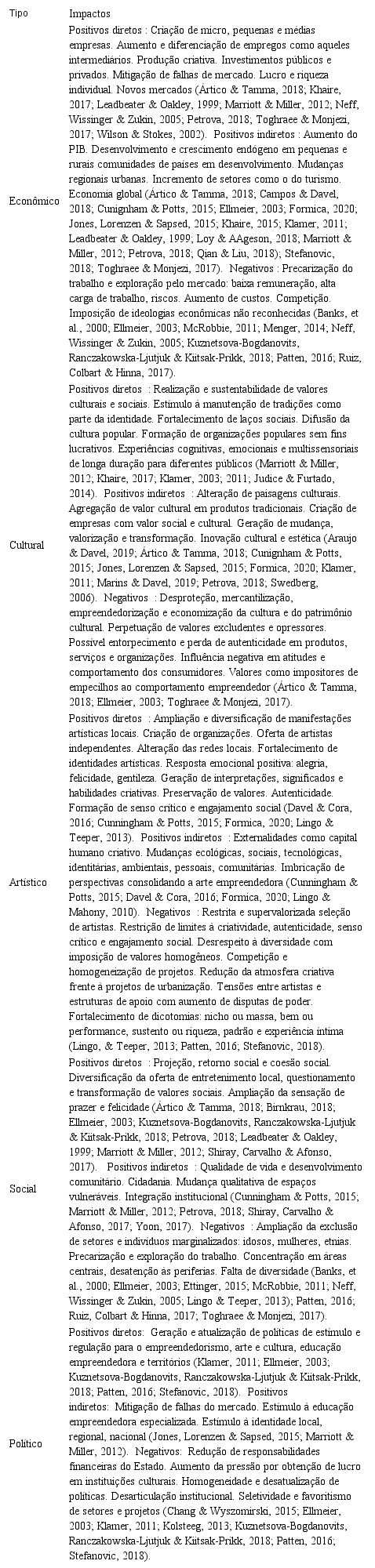 Não identificamos estudos aprofundados ou sistematizados sobre impactos, apesar de serem recorrentemente citados de forma indireta ou pontual. A partir de uma análise mais densa e atenta da produção acadêmica, foi possível sistematizar e categorizar um conjunto de impactos (Tabela 2). O empreendedorismo nas artes e na cultura apresenta grande potencial (Leadbeater & Oakley 1999), pois enfrenta uma velocidade acirrada e intensa de mudanças (Cunignham, & Potts, 2015, Ellmeier, 2003; Klamer, 2011; Khaire, 2017). Os impactos são intencionais, não intencionais, planejados e não planejados, diretos e indiretos, negativos e positivos, tangíveis e intangíveis (Toghraee & Monjezi, 2017; Petrova, 2018). Envolvem pessoas, organizações e regiões desde empreendedores atuais à potenciais, gestores culturais, artistas, críticos, educadores, líderes comunitários, formadores de políticas e acadêmicos. Não encontramos estudos significativos para a categoria ambiental.