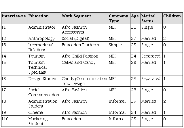 It should be reinforced that exploratory research is designed to promote greater familiarity with the studied phenomenon, in order to make it more explicit or to construct assumptions (GIL, 2007). Thus, within these precepts, this study involved bibliographic research and semi-structured interviews with 10 black female social entrepreneurs from the city of Rio de Janeiro with college degrees who participated in the city’s support and training program between 2019 and 2020, as we can identify in Table I. The names of the interviewees have been maintained anonymous.