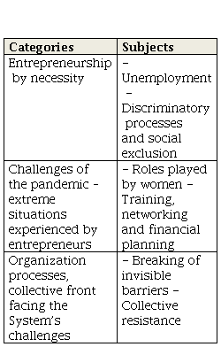 In the next topic of this work, the results will be presented in three sections of analysis, which follow the order of appearance of the emergent categories. The first category shows the main inductive motives and challenges encountered in the practice of entrepreneurship by necessity, even before the pandemic. In the second category, we intend to analyze the perceptions of these groups in the middle of the pandemic and the difficulties encountered in this path, and finally, the third step presents actions initiated and promoted by these subjects as a form of survival, breaking invisible barriers, and resistance.