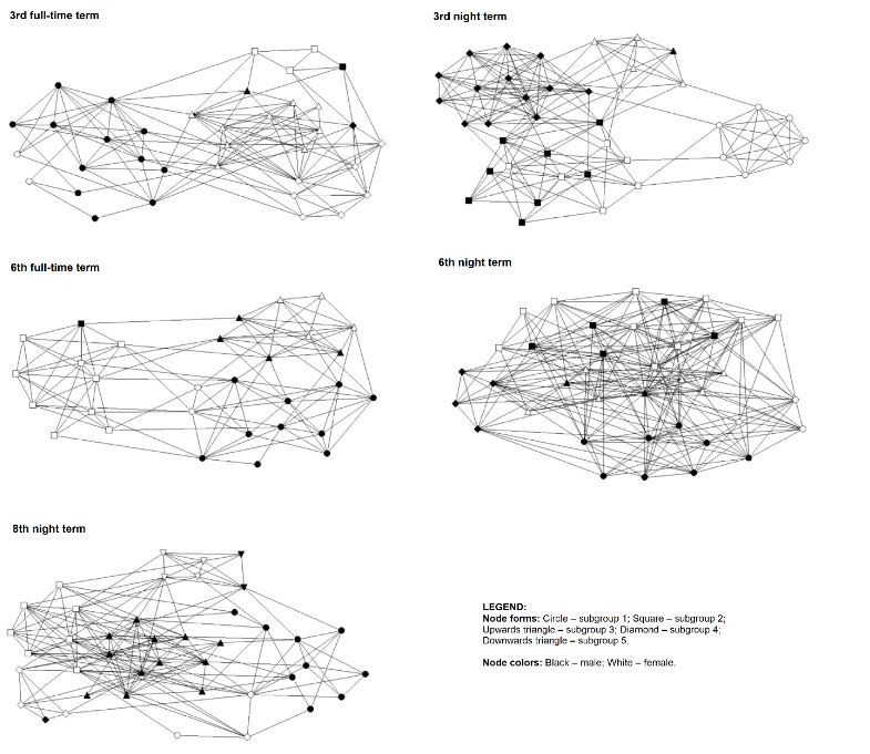 The networks shown in Figure 1 were segmented by the communities that are formed according to the density of relationships. The different shapes of the nodes disclose these communities (subgroups).