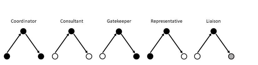 In this section we seek to identify the social roles that certain students play in the networks regarding brokerage between the subgroups. Intuitively, intermediation is the condition in which a network node acts as an intermediary between two others. Gould and Fernandez (1989) present five types of brokerage: Coordinator, Consultant, Gatekeeper, Representative and Liaison. Figure 2 illustrates this.