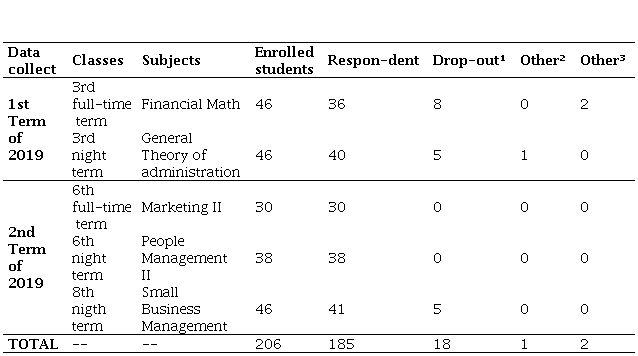 The selection of the other three classes, in the second semester of 2019, started with the same method used in the previous classes, that is, by analyzing the number of students enrolled in the disciplines of the semester, seeking those with the largest sample, with the smallest number of dropouts or irregular students. The selected subjects were: Marketing II (6th full time term), Small Business Management (8th night term), People Management II (6th night term). In the Marketing II and People Management II disciplines, all enrolled students responded to the questionnaire, with a total of 68 students, 30 students from the Marketing II discipline and 38 students from the People Management II discipline. The total number of questionnaires not applied in this stage was five, all of which were in the Small Business Management discipline, due to student dropout.
