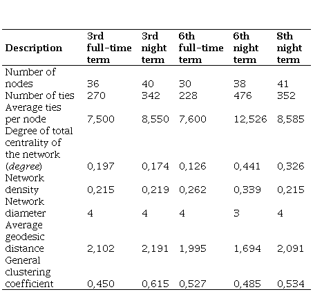 General clustering coefficient is the average of the coefficient of clustering of all the actors and allows to perceive the networks that are notoriously separated by structural holes (or areas of low density). This is the same as saying that networks with higher coefficients have greater separation between their subgroups. The 3rd night term was the group with the highest coefficient, that is, it was the network that presented well-defined subgroups. The classes of the 3rd full-time term and 6th night term were those with the lowest coefficients and their subgroups are not so separated from each other.