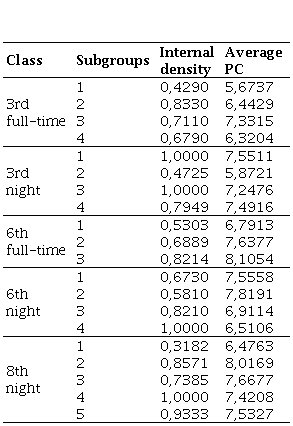 Among these results, we highlight as research findings, the clear identification of "cliques", especially in the 3rd night class, as shown in Table 2. Furthermore, this finding was associated with the performance of the subgroups, presenting a different result from that found in the literature researched, as the performance is not so well associated with the cohesion of the subgroups, but with students with superior performances situated in central positions, who receive the flow from other subgroups into their own subgroup. This gives them power in terms of relationships between students, which can mean privileged access to information.