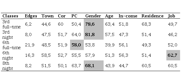 As explained in Table 4, the 6th Night class was the only one that presented their chances of establishing numerically similar ties, with no significant difference between attributes, as in the other classes, which may indicate the presence of heterophilia in the formation of bonds (Carbonai, 2017). This can perhaps be explained by the high social cohesion that the class presents. This can be explained by the high social cohesion that the class presents.