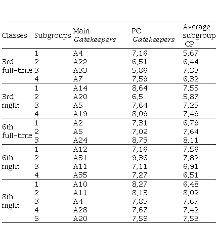 The position of intermediation between subgroups performed by certain students seems to have an impact on academic performance. Of the twenty students in gatekeeper positions, only three did not have a PC greater than the average of the subgroup to which they belonged (students A33 from the 3rd full-time, A5 from the 6th full-time and A12 from the 6th night).