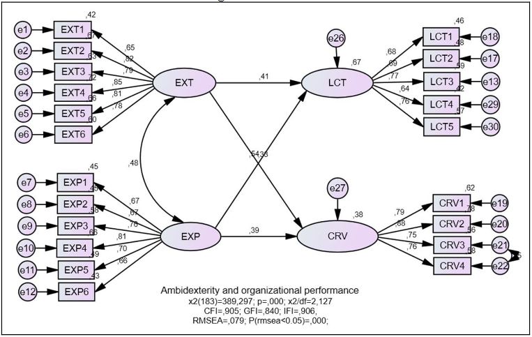 Figure 2 presents the results of the proposed framework. It is noticed that the exploration and explitation relationship was performed through covariance. This statistical device was also used in previous research involving SEM, with the purpose of testing empirical models (Kristal et al., 2010; Jardon & Silva, 2017; Shou et al., 2018). The image still reveals a good fit of the tested model: χ² = 389.297; df = 183; p = 0.000; χ²/df = 2.127; CFI = 0.905; GFI = 0.840; IFI = 0.906; RMSEA = 0.079; P (RMSEA) <0.001).