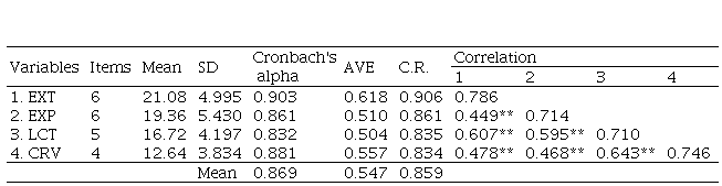 Table 1 also shows the results of Cronbach's alpha, for each construct they were higher than 0.8 (Hair Jr. et al., 2009). Convergent validity was proven based on the results of the AVE (Average Variance Extracted)> 0.5, and the C.R. (composite reliability)> 0.8 (Fornell & Larcker, 1981). The discriminant analysis was attested by the values of the AVE squared, arranged in bold diagonal (Hair Jr. et al., 2009). The results of the diagonal were superior to those of Pearson's correlation, in their respective lines and columns (Table 1), which proves the discriminant validity.