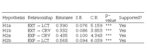 The results of the hypothesis test can be seen in Table 2. The hypothesis H1a was accepted (EXT→LCT), indicating strength between the variables (β = 0.390; S.E = 0.076; C.R = 5,159; p-value <0.001). The positive and significant relationship between exploration and profitability indicates that exporting companies have made a profit when operating in international markets. This option may be interesting for exporting companies that seek to increase revenue and, consequently, obtain profitability.