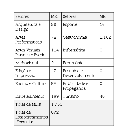 Caruaru lida com a chegada de investimentos governamentais para o fomento da inovação na cidade, por exemplo, com a construção do Armazém da Criatividade (AC), que atua com o empreendedorismo, experimentação, exibição e educação, e com o trabalho desenvolvido pelo Instituto de Tecnologia de Pernambuco (ITEP). Além disso, o Sebrae-PE também atua na cidade, proporcionando capacitações para empreendedores(as) e "[...] consultorias gerenciais com preço subsidiado às pequenas empresas, [...]", bem como outras instituições de âmbito político, que por vezes, se propõe a arrecadar recursos destinados às empresas locais, tais como "[...] a Câmara de Dirigentes Lojistas (CDL) e a Associação Comercial e Industrial de Caruaru (ACIC)." Há também as organizações mais voltadas à capacitação técnica dos indivíduos, como "o Serviço Nacional de Aprendizagem Industrial (SENAI) e o Serviço Nacional de Aprendizagem Comercial (SENAC) [...]" (Santos, Schmidt, & Zen, 2018, p. 12). Com base em dados da Secretaria de Desenvolvimento Econômico e Economia Criativa de Caruaru (SEDEEC), em 2019 a cidade detinha o seguinte quantitativo de MEIs, que envolvem a EC em suas atividades laborais (ver quadro 1).