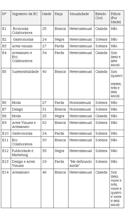 Utilizou-se a saturação de respostas como indício para encerramento das coletas de informações (Paiva Júnior, Souza Leão, & Mello, 2011). Desse modo, a pesquisa abrangeu um total de quatorze empreendedoras que serão representadas do E1 ao E14. Dessas quatorze, cinco delas foram entrevistadas por videoconferência, devido à pandemia. As outras nove entrevistadas foram entrevistadas por meio de formulário do Google Forms, por não terem disponibilidade e/ou intimidade com a videoconferência.