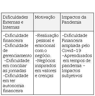 No que diz respeito aos impactos da pandemia do Covid-19 na atuação das empreendedoras caruaruense e suas subjetividades, foi possível observar: 1) o impacto da falta de uma reserva financeira; 2) o impacto em relação ao valor dos seus produtos; 3) a dificuldade para conseguir matéria-prima, como as madeiras para construir os quadros ou as bolsas recicláveis que atendam às exigências sanitárias; 4) a necessidade de estarem em outras plataformas de venda on-line e sentirem o impacto de precisarem estar à frente destas redes sociais; 5) a alteração do humor, o medo e tensão ocasionados pela Covid-19 e que impactam na produtividade e criatividade das empreendedoras e por fim 6) as múltiplas jornadas de trabalho em home office, que afetou a organização e produtividade delas. Assim, percebe-se, em muitos desses impactos, o agravamento de dificuldades existentes antes da pandemia.