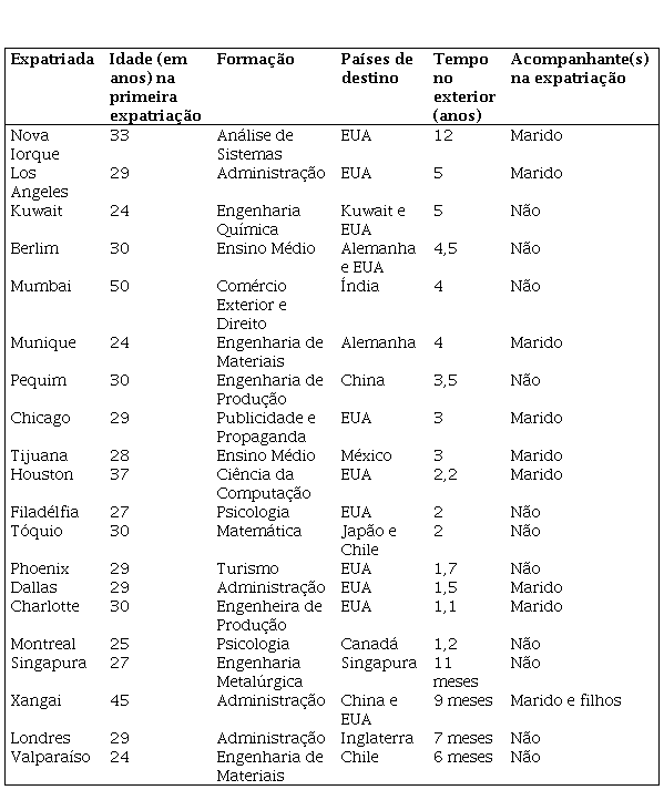 Participaram da pesquisa 20 mulheres brasileiras, expatriadas por no mínimo seis meses, com idades entre 24 e 50 anos, de diversas áreas de formação, que atuam em variados ramos empresariais e que foram transferidas para um total 11 países (Figura 1). A indicação de potenciais participantes foi impulsionada por contatos pessoais das pesquisadoras em empresas multinacionais e, posteriormente, uma expatriada foi indicando outra da mesma empresa ou que conheceu durante a expatriação, caracterizando a técnica de bola de neve. Seus nomes foram substituídos na pesquisa por topônimos de cidades do país de destino, para garantir-lhes o anonimato.