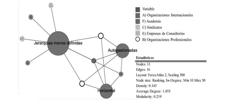 El Formato Organizacional Interno, que es como se predicen las dinámicas de relaciones laborales internas de una organización en el futuro del trabajo, estuve en total de 28 actores considerados en la investigación, la variable ha sido citada por 8, siendo el 67% de las Organizaciones Profesionales, el 50% de las Empresas de Consultoría, el 30% de la Academia y el 14% de las Organizaciones Internacionales. Las 3 respuestas identificadas – Jerarquías menos definidas (8 conexiones), Horizontal (4) y Autogestionadas (4), indican relaciones laborales en que el poder y la dinámica comando/control dan espacio para relaciones más colaborativas o participativas (Figura 10).