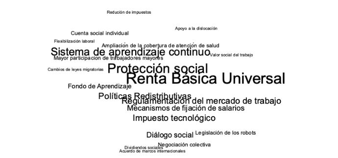 En el análisis han sido identificados 21 atributos (respuestas) para esta variable, con un promedio de 4,6 por cada actor. En el centro de la Figura 13 se encuentran las respuestas Renta Básica Universal, con 11 citaciones, y Protección social, con 9 citaciones, los atributos con mayores grados y centralidad en la representación. También se destacan las respuestas Sistema de aprendizaje continuo (7), Reglamentación del mercado de trabajo (5), Impuesto tecnológico (5) y Políticas Redistributivas (5).
