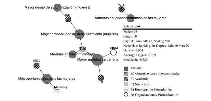 Lo que implica la variable de Genero, un total de 28 actores considerados en la investigación, la variable ha sido citada por 7, siendo el 57% de las Organizaciones Internacionales, el 33% de las Organizaciones Profesionales y el 25% de los Sindicatos y Empresas de Consultoría. Cabe destacar que no hubo citaciones por parte de los actores de la Academia. En total 6 diferentes respuestas fueron recogidas, con un promedio de 0,85 respuestas por actor. El atributo con más conexiones es la previsión de Mayor equidad de género, citado por 3 de los 6 actores. Cuatro de las seis predicciones consideran futuros positivos para las mujeres en relación con el tema género en el futuro del trabajo: la Mayor equidad de género (3 citaciones), Más oportunidades para las mujeres (2), Aumento del poder económico de las mujeres (1), Medidas antidiscriminatorias (1). Por otro lado, dos presentan amenazas: Mayor probabilidad de desplazamiento (mujeres) (2) y Mayor riesgo de automatización (mujeres) (1) – (Figura 15).