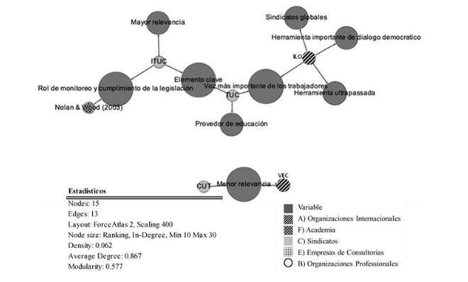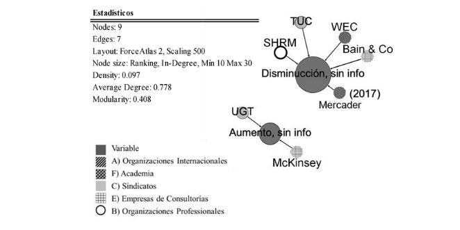 Resumen: Con el objetivo de comparar diferentes discursos y narrativas sobre el futuro del trabajo, este artículo realizó un análisis de redes sociales a partir de la selección de 40 actores de organizaciones internacionales, organizaciones profesionales, sindicatos, partidos políticos, empresas de consultoría y de la academia, de diferentes países. A partir de la recopilación de datos disponibles en publicaciones de los actores seleccionados, fueron medidas 35 variables divididas entre los bloques Empleo, Tecnología, Mercado y Socioeconomía. Este artículo reconoce que una narrativa lineal y unidimensional puede no capturar y reflejar los heterogéneos significados de qué es trabajar en el mundo contemporáneo.