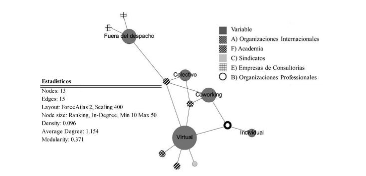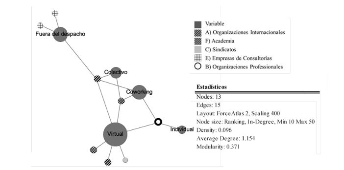 Con respecto al espacio de trabajo, la desaparición, señalada por Narotzky (2018), la distinción entre lugar/tiempo dedicado al trabajo y lugar/tiempo dedicado a la vida personal, que se produce cada vez más, ya que dicho trabajo productivo invade el hogar y el tiempo de descanso u ocio. Del total de 28 actores considerados en la investigación, la variable Espacio de Trabajo ha sido citada por 8, siendo el 50% de las Empresas de Consultoría, el 33% de las Organizaciones Profesionales, el 29% de las Organizaciones Internacionales, el 25% de los Sindicatos y el 20% de la Academia. En total 5 diferentes respuestas fueron recogidas, con un promedio de 0,6 respuestas por actor. Las visiones predicen modelos de espacios de trabajo no físicos y no individuales: el atributo con más conexiones es Virtual, citado por 6 de los 8 actores, seguido de Coworking (3), Colectivo (2), Fuera del despacho (2) e Individual (1) - (Figura 4).