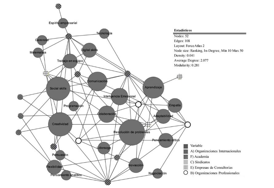 La primera variable, de las habilidades resumidas, ha clasificado las calificaciones entre habilidades personales y habilidades técnicas, identificando que las personales han sido citadas por todos los 10 actores, mientras las técnicas han sido citadas, a la vez, por 4 de ellos. Con relación a las habilidades detalladas, 36 diferentes competencias han sido citadas, siendo las más representativas la Resolución de Problemas (9 citaciones), Creatividad (8), Social Skills (8), Aprendizaje (7), Comunicación (6), Inteligencia Emocional (6), Colaboración (5), Pensamiento Crítico (4), Empatía (4), Trabajo en Equipo (4), de un total de 16 actores (Figura 2). El promedio de citaciones por actor es de 6,75 habilidades, mientras que el top 3 es compuesto por los actores WEF, ILO y World Bank, con 19, 14 y 13 respectivamente. Estos resultados refuerzan que lo señalado por estudios como los realizados por Lopes (2020) y Aguiar (2020): las transformaciones derivadas de los rápidos avances tecnológicos, la tendencia al envejecimiento de la población y los nuevos modelos de negocio han impactado en el mundo del trabajo y en los sistemas educativos y de protección social.