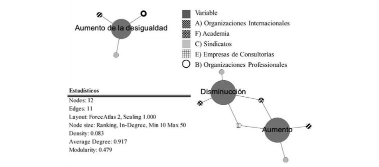 En total 3 diferentes respuestas fueron recogidas, con un promedio de 0,3 respuestas por actor, dividiendo las visiones entre Aumento (4 citaciones), Disminución (4) y Aumento de la desigualdad (3) - (Figura 3). Las respuestas demuestran coherencia entre una fragmentación, de igual tamaño, entre las visiones positivas y negativas, mientras que la predicción de desigualdad es resultado de estos dos movimientos – aumento y disminución. Se destaca que dos actores han predicho el aumento y la disminución a la vez: Bain & Co (Empresas de Consultoría) y Autor, 2015 (Academia). Todavía, es importante destacar que, independientemente de si la tendencia hacia los salarios se incrementa o disminuye, y las consecuencias de las variaciones alcanzan todo el gradiente socioeconómico y profesional, estas afectan más negativamente a los grupos de trabajadores con menor cualificación (Prainsack & Buyx, 2018).