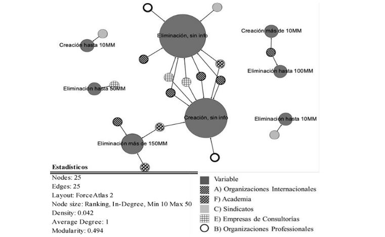 Las narrativas presentan más visiones de eliminaciones de puestos de que de creaciones, además de las eliminaciones presentaren cantidades o porcentajes mayores. Mientras las predicciones de nuevos puestos llegan a un rango de hasta más de 10 millones o hasta un 20% de los puestos actuales, las predicciones de eliminación de puestos, que ha sido citada por más actores, llegan hasta eliminaciones de más de 150 millones de puestos o hasta más del 30% de los puestos actuales. Predecir una cantidad o un porcentaje no parece ser una tarea sencilla así que los resultados con más citaciones han sido la afirmación de que habrá eliminación de puestos, pero sin información adicional, como se puede ver en la figura 6. Al analizar la relación entre las predicciones y los actores es posible identificar que 8 actores (4 de ellos del tipo A) Organizaciones Internacionales) predicen, al mismo tiempo, creaciones y eliminaciones de puestos de trabajo. A este respecto, Pulkka (2017) subraya que las tecnologías digitales no solo significan una amenaza de aumento del desempleo tecnológico, sino también una organización del trabajo más flexible. Esto se debe a que, aunque los puestos de trabajo no pueden ser reemplazados a mayor escala por la automatización, es razonable esperar una mayor inseguridad en el horizonte del mercado laboral, especialmente debido a las tareas que cambian rápidamente y a su organización cada vez más digitalizada.