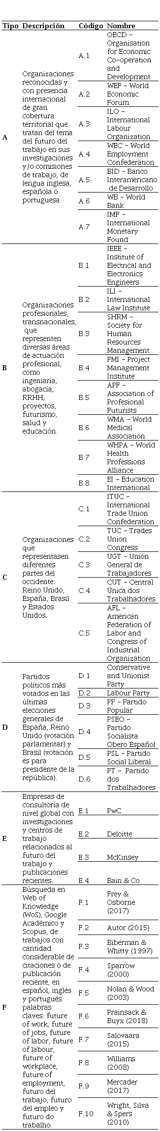Para que este análisis pueda contener diferentes posiciones, ideologías y perspectivas, para que sea considerado un retracto no sesgado de los diferentes actores sociales existentes, es necesario la realización de una reflexión metodológica de cuáles actores a ser seleccionados y cómo. Previamente a la selección de los actores a ser analizados, fueron creados seis Tipos agrupadores para ser utilizadas en la comparación entre los diferentes discursos: A) Organizaciones Internacionales; B) Organizaciones Profesionales; C) Empresas de Consultoría; D) Partidos Políticos; E) Sindicatos y F) Academia. Estos Tipos fueron elegidos a partir del entendimiento de que los actores a ser estudiados deberían ser plurales y representativos de diferentes esferas de la sociedad en que vivimos, para que los diferentes discursos y narrativas pudieran enriquecer el análisis llevado a cabo.