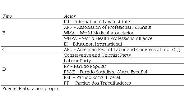 En este contexto, y de una metodología en la que la elección de los actores se produce antes de la verificación de contenido específico y suficiente sobre el futuro del trabajo, es importante resaltar no específicamente los actores sin contenido, sino los Tipos. Es relevante identificar que ninguno de los seis Partidos Políticos investigados, con gran representación en tres países diferentes, presentó, de manera explícita y directa, en su discurso el futuro del trabajo como tema, aunque algunos presentaron proyectos y políticas que sí tienen en cuenta los cambios en curso y los proyectados en el mercado laboral y educación. Cabe señalar que los Partidos Políticos no tienen como eximirse de abordar el tema, aunque indirectamente, ya que la proyección de escenarios sobre el futuro del trabajo depende de un conjunto de condiciones macroeconómicas, sociales y culturales, las decisiones políticas del Estado y de los organismos internacionales, las políticas públicas relacionadas con los sistemas educativos y la confianza entre los diferentes actores sociales (Marques, 2013).