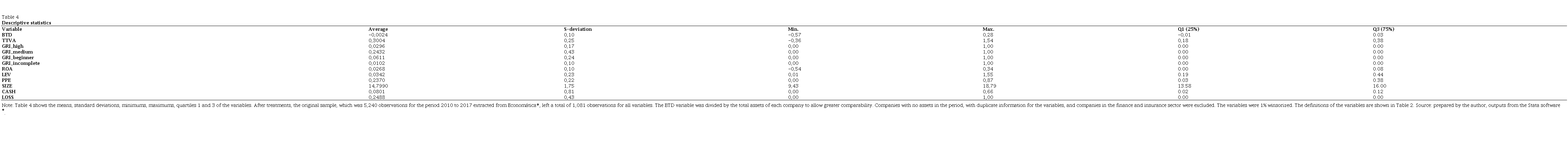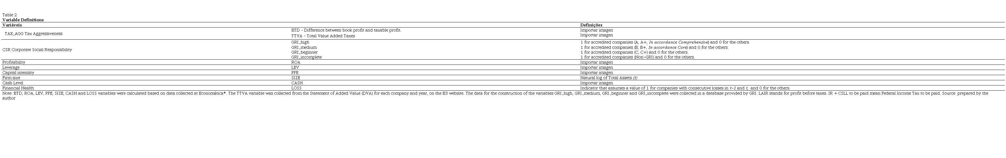 To measure the tax aggressiveness of companies, the Box-Tax Difference (BTD) metrics and Total Value Added Tax (TTVA) were used. As CSR proxies, it was considered whether or not the company published a sustainability report under the guidelines of the Global Reporting Initiative (GRI), and which level of structure was used to differentiate between higher and lower disclosure levels, with four stages being established: high, intermediate, beginner and incomplete.