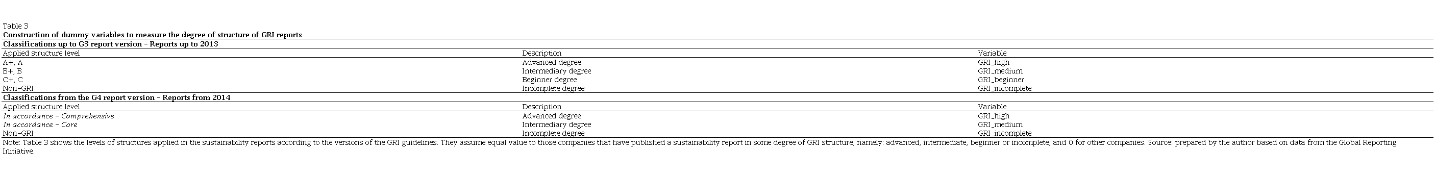 Up to the GRI G3 reporting version, the structure level is built by reporting classification criteria in beginners (C), intermediaries (B) e advanced (A). Submitting the sustainability report for GRI examination, or to an external compliance report, credits the company with a score (+), thus, C+, B+ or A+. (Madalena et al., 2016). From the reports with the GRI G4 version, published as of 2014, the level of structure started to be classified in a low level of disclosure (N), satisfatóri (In accordance – Core) and understanding (In accordance – Comprehensive) (GRI, 2014).