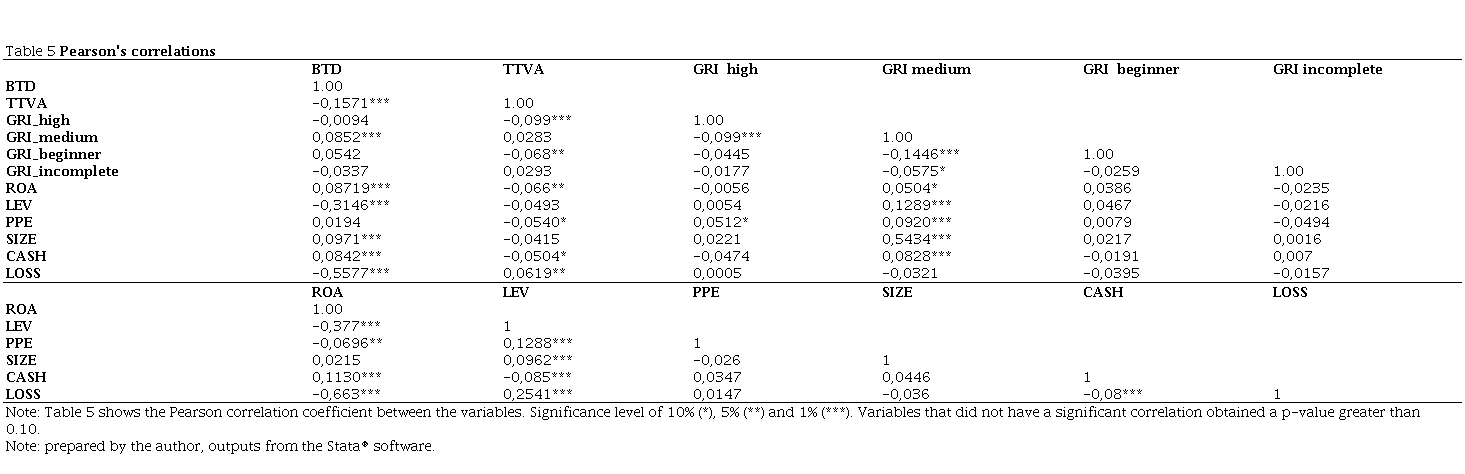 Table 5, in turn, shows the results of Pearson's correlation. There is a positive correlation between the variable GRI_medium with BTD at the significance level of 1%, thus suggesting that companies with higher levels of socially responsible practices tend to be more tax aggressive. This result can also be seen in the negative correlation between GRI_beginner and the TTVA metric at the 5% significance level. The correlation is evidence of an association between two variables, not controlled by other characteristics of the firms, which can simultaneously affect this relationship.